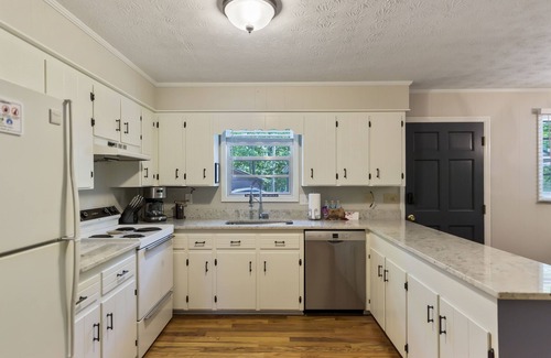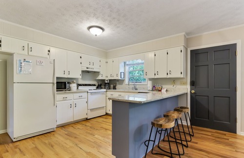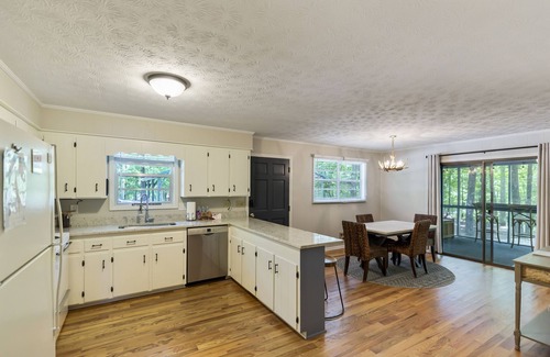 Open concept kitchen/dining/living room. Head outside where we offer a gas grill, which we supply the propane for and instructions in our welcome binder. There is also a beautiful outdoor dining table on the screened in porch to enjoy eating outdoors. We have also included a high chair for your little one, available UPON REQUEST.