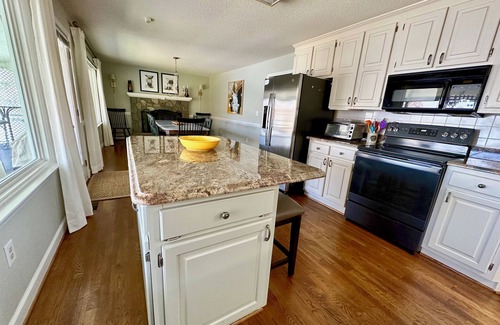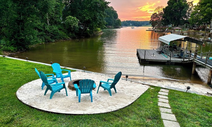 Family friendly Lake Hickory home with private dock and sandy beach. Only steps to the water! Enjoy the large yard and firepit. Screen porch and open deck with gas grill and dining table overlooking the water. Home is on quiet cove off the main channel-perfect for kayaking, floating, and fishing. Home is conveniently located close to Rock Barn and Hickory Metro Convention Center.