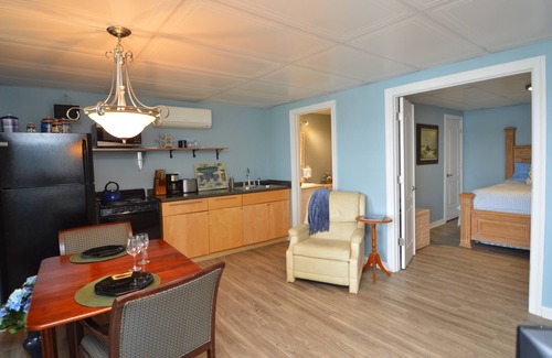 The unit offers complete kitchens with a full-size refrigerator, stove/oven, microwave, coffee maker, toaster and all you might need to cook at home.The apartment is fully furnished, to include linens and towels and kitchen utensils and cookware. Guests bring toiletries, personal items and all paper products such as toilet paper and paper towels.To assure privacy, the unit has its own private entrance and nothing is shared on the property except for the parking area, the patio which is about 50 feet long (huge), and the dock.
