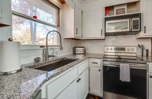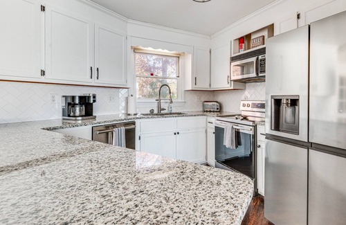 MAIN KITCHEN: Stove/oven, refrigerator, microwave, dishwasher, dishware/flatware, cooking basics, Keurig coffee maker, toaster, breakfast bar