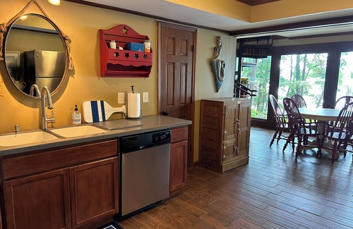 The upper level of the house has a large great room with vaulted ceilings, a real stone wood-burning fireplace, 60” flat screen TV, and floor-to ceiling windows facing the lake. This area is a large open floor concept with 3 large seating areas with a sofa, 8 arm chairs - plenty of room to gather or spread out with family. The dining area has a 9ft farm house dining table that has seating for 10+ people, as well as extra dining seating at the bar area and island area of the kitchen. The kitchen includes all new stainless steel appliances- refrigerator, gas range with heat lamps and oven, traditional coffee maker, kuerig coffee maker, microwave, and dishwasher. The great room opens to an outdoor covered deck with a dining table/chairs and leads to the open deck area with a gas grill and great screened porch with a new fireplace, sofa and dining area with a 9ft picnic table. All outdoor areas have multiple ceiling fans. All bedrooms, except for bunk bedroom, have ceiling fans. The large master bedroom has a king size bed, sitting area and walk-in closet. The master bath is enormous, including a garden tub, separate rain-head shower with bench, and double vanities with extra lighting. The master suite has its own covered deck, including a love seat and 2 chairs w/ottomans, with a beautiful view of the lake. The second upstairs bedroom features a queen bed with another fabulous view of the lake. This bedroom shares a bathroom with the third upstairs bedroom across the hall in which has two sets of bunk beds (4 twin beds) – a great fun space for kids! All the bedrooms have TV's. There are a total of 3 bedrooms on the main level located on the same level with the kitchen/dining area/living room/laundry room. There are no stairs to navigate on this level.