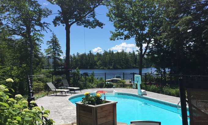 Private waterfront with dock. Open floor plan with large stone fireplace, dining farmtable overlooking the lake, master bedroom with queen bed/jacuzzi bath and 1/2 bath on 1st floor. 2nd bedroom with queen bed and twin, bunk room with 5 twins, including triple bunk bed and full bath occupy 2nd floor. Main cabin sleeps 10. Detached garage with living space above, kitchenette, full bath, queen bed and trundle, sleeps 4 total. Outside patio with seating overlooks heated pool and lakefront. Swim, kayak, paddle board, canoe, play games in the yard in this quiet, serene, beautiful cove. 4 kayaks, 2 paddle boards, a canoe and pedal boat included. Nighttime fire pit and s’mores by the water’s edge. Year round rental. Minutes from North Conway outlets, downtown, and Cranmore and Attitash. A perfect vacation spot for families! (Pool opens mid May- mid October)