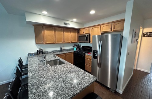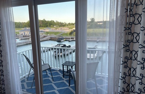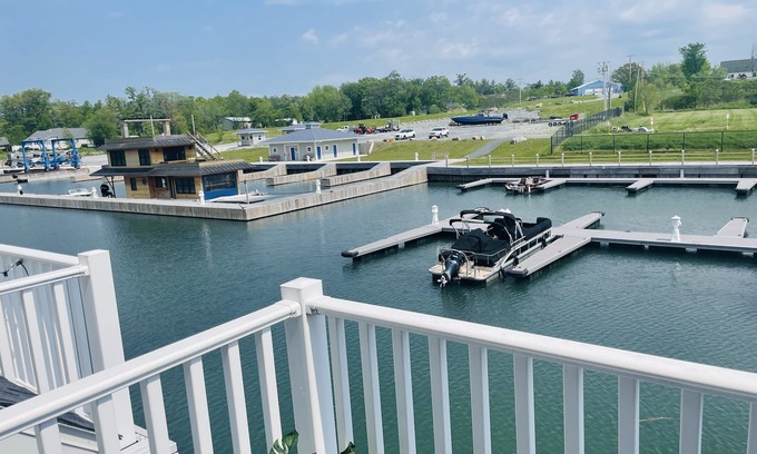 Renovated 2 bedroom boathouse in the heart of the Thousand Islands. Come relax in this clean air conditioned condo located in Alexandria Bay, on a small channel off of the St. Lawrence River. Your family will be comfortable with a customizable Select Comfort KING size bed in the master, along with two full bathrooms, a living room, TV den and loft with two queen beds. Enjoy the luxurious tile, granite counters and gas stove. Bicycles are provided for your enjoyment. The included boathouse can accommodate up to a 34 ft boat! The beautiful balcony overlooks the brand new marina in Carnegie bay, and comes equipped with a Weber grill and two zero gravity chairs to relax. Elevator on site. Boat not included, but you are welcome to bring your own or rent one. Walking distance to the many bars, shops and restaurants in downtown Alexandria Bay!