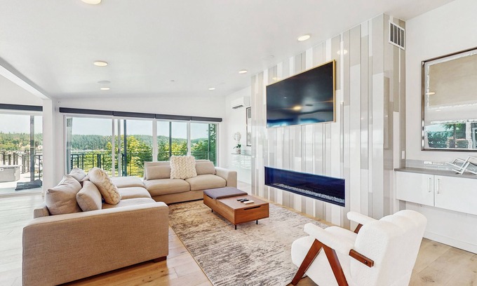 The open-concept living area features brand-new, high-end appliances, warm contemporary furnishings, and expansive windows that invite the outdoors in. Whether you're gathered around the oversized dining table for a meal or relaxing in the living room with a glass of wine and a view, every space in the home feels welcoming and serene.