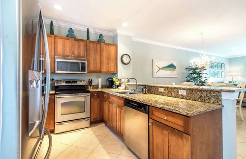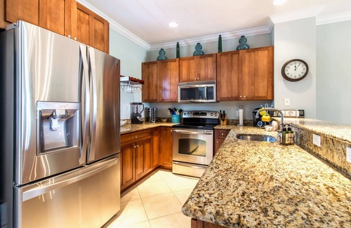In this well laid out town home, the second delightful upstairs bedroom has a dreamy Queen bed with a 26" flat screen TV and a balcony with chairs and side tables to relax at. The third bedroom features two twin beds, making the villa a very comfortable destination for up to 6 people, for mini adults ages 5 and up! Full sized washer and dryer are conveniently located next to the bathroom near the two bedrooms.