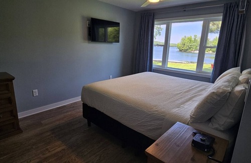 Enjoy the convenience of a fully equipped kitchen and dining area, perfect for home-cooked meals or takeout from local restaurants. Whether you're sipping your morning coffee overlooking the water or unwinding after a day of outdoor adventure, this suite offers all the comforts of home in an unbeatable lakefront setting.