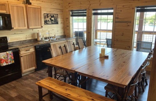 As you round the shoreline, the stretching waterfront landscape will catch your eye as you approach the parking lot directly in front of the lodge (Yes! There is ample space for a trailer!). You will use a keyless lock system to enter your cabin.