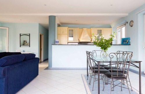 3-room apartment 110 m2, on the ground floor. Living/dining room with satellite TV and air conditioning. Exit to the terrace. 1 room with 1 french bed (160 cm, length 200 cm), shower/WC and air conditioning. Exit to the terrace. 1 room with 1 french bed (160 cm, length 200 cm), shower/WC, hydro massage bath and air conditioning. Exit to the terrace. Open kitchen (4 hot plates, oven, dishwasher, toaster, kettle, microwave, freezer) with dining table. Sep. WC. Upper floor: living/dining room with satellite TV and air conditioning. Exit to the balcony. 1 room with 1 french bed (160 cm, length 200 cm), shower/WC and air conditioning. Exit to the balcony. 1 room with 1 french bed (160 cm, length 200 cm), shower/WC, hydro massage bath and air conditioning. Open kitchen (4 hot plates, oven, dishwasher, toaster, kettle, microwave, freezer) with dining table. Sep. WC. Balcony 30 m2, terrace 30 m2, roofed. Terrace furniture, balcony furniture. Beautiful view of the sea and the bay. Facilities: Internet (WiFi, free). Please note: not suitable for children under 10 years. Non-smokers only. No internal connecting door between the separated properties. The house consists of 2 apartments rented as one unit. The first apartment on the ground floor with living/dining area, open kitchen and 2 bedrooms. the second apartment on the upper floor with living/dining area, open kitchen and 2 bedrooms. The propety with all of its content is for private use.