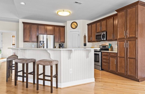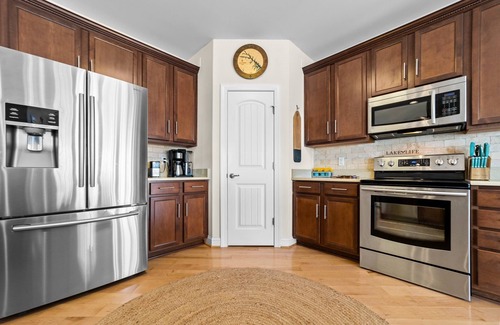The living area of this two-story home has window-lined walls with beautiful lake views. Kick back with a vacation read or stretch out and watch a movie after a day outdoors. The modern kitchen is outfitted with stainless steel appliances and well stocked with all the tools a home chef might need. Eight can sit for family-style meals at the dining table, a six-person folding table + chairs in the garage can be used for larger groups. There is also bar seating and a five-person table on the adjoining deck.