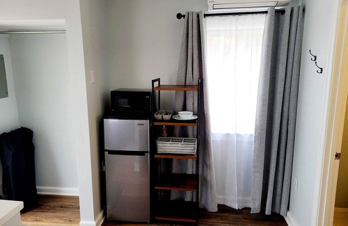 Queen bedroom studio efficiency, with full bathroom. Wi-Fi. Smart TV. AC/Heat. Fridge/freezer, toaster oven, microwave, coffee maker.