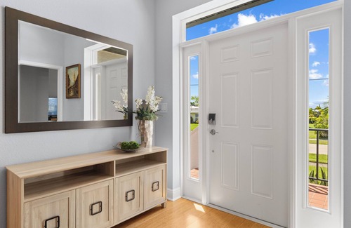 Welcome to our stunning two-story, contemporary Euro-style villa, where modern luxury meets coastal charm! This 4-bedroom, 2.5-bath home comfortably sleeps 10, offering ample indoor and outdoor space for unforgettable gatherings. Prepare gourmet meals in the fully equipped kitchen, then unwind in the resort-style pool area featuring a large, deep, heated saltwater pool, lounge chairs, and a BBQ for al fresco dining.
