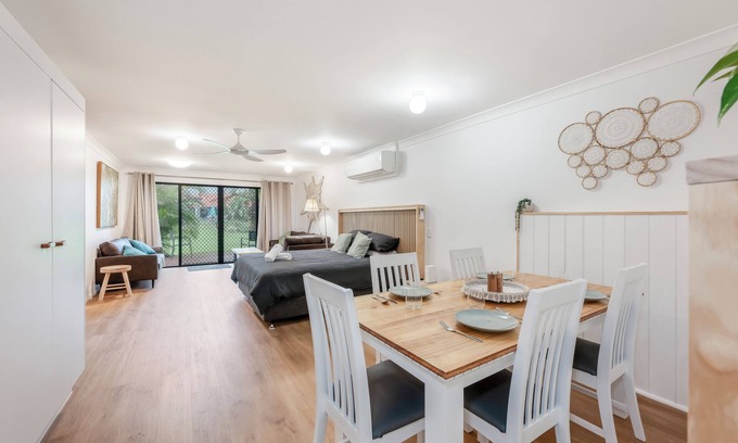 This beautifully furnished studio plus bedroom villa is designed for ultimate comfort and relaxation, accommodating up to 5 guests. With brand new furnishings, a well-equipped kitchen and premium entertainment options, Villa 32 is the perfect getaway for families, couples, or small groups. On arrival there is a free single under cover carpark (clearance 2.2 metres) at the front of the villa and further guest parking nearby.