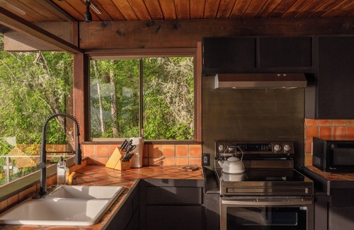 INDOOR LIVING: Projector screen w/ Firestick, Sonos sound system, dining area, wood-burning stove, bathtub, high-end fixtures & lighting
