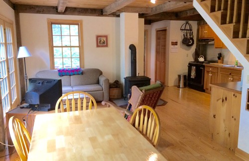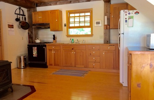 Enjoy this beautiful 1990 constructed post and beam home nestled in the woods on a private five acre retreat. This home has cathedral ceilings, hardwood floors throughout, an open floor plan with lots of windows. The first floor bedroom has a queen-size bed and views through the woods to the water. There is a half-bath on the first floor. Walk upstairs to a private, spacious loft with two twin beds and a full bathroom. Watch the change of the water on this tidal cove (11 ft tidal change). Swim at high tide off granite ledges and enjoy low tide walks along the shoreline. Your stay includes all bed linens and bath towels.