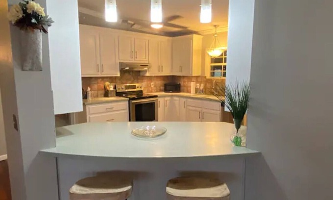 Kitchen - fully equipped with a blender, slow cooker, cooking utensils, dishes, serving trays, a microwave, toaster, a fridge, stove/oven, and a coffee area. It also has a large island -- with 2 barstools -- that opens to the living room.