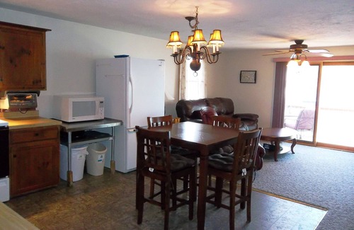 This cozy retreat features an open floor plan with a kitchen, dining area, and living room that flow seamlessly together. The kitchen is fully equipped with a refrigerator, microwave, dishwasher, electric range, and all the cooking utensils you'll need. Relax on the leather reclining couch and chair in the living room, where you'll find a flat-screen TV and DVD player for your entertainment. Each of the two large bedrooms is furnished with comfortable beds (1 king, 1 queen) and includes a flat-screen TV. Linens are provided for your convenience, and there's a washer and dryer in the unit for your use.