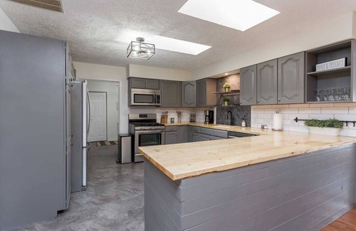 * Updated kitchen with stainless steel appliances, an abundance of cabinetry, custom-built wood countertops. Fully stocked with drip coffee maker, crockpot, blender, toaster, plates, cups, wine glasses, silverware, cookware, pots and pans, etc!