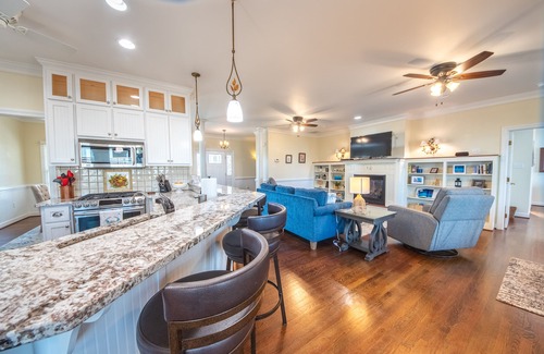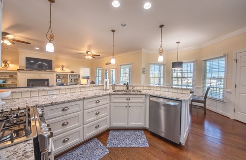 The entire back of the home has great views of the water. The primary bedroom has a writing desk with an amazing water view; it's so nice to wake up to that view! The upstairs "bonus" room (with a private outdoor deck that overlooks the water and the outdoor pool) and is a multi-purpose room that includes office space, pool table, reclining sofa and a separate trundle bed (2 twins), along with a powder room! This space is huge and is a great spot to hang out with the family at night or get away and work during the day.