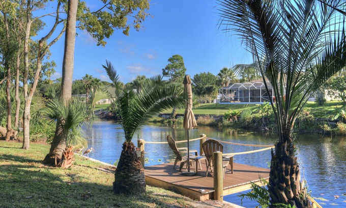 Waterfront Retreat...Enjoy our 2 Bedroom 2 Bathroom Fully-Renovated Relaxing Coastal Themed Home! That is located in the perfect spot for Sky- Diving, Fishing, Boating, Kayaking, Golfing, and Relaxing on the beach. Close to lots of great Restaurants and Bars right on the Indian River Lagoon. Located on a canal with a private dock for fishing and a kayak launch. Just 5-7 minutes away from Capt Hirams and Earls Hideaway. Just 5 minutes from the Indian River Lagoon & 10-15 minutes from the Beach!