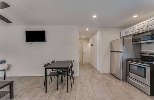 - Full Kitchen with a full-sized fridge, electric stove, oven, microwave, and ample counter space