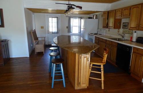The house easily sleeps 10 with 4 bedrooms (2 bedrooms on each wing) and a sleeper sofa, 2 full bathrooms, central air and heat, cable TV, a fully equipped kitchen, a river-side "glassed in" porch with a gorgeous waterfront view, washer-dryer, and a large waterside family room.