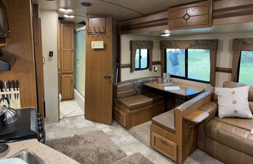 Our camper features one queen master bedroom with closing doors and closets, as well as a full/double pull out couch. The table area can also be converted into a bed for a small child if needed. Our RV is equipped with a full indoor kitchen and half outdoor kitchen. We have a full size gas outdoor BBQ grill and our outdoor covered gazebo. It’s a perfect place for who is open to tiny living, adventure and escape to nature.