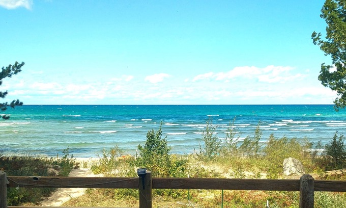 Directly on Hammond Bay of Lake Huron, this house is secluded within the trees, with million dollar views of the lake from the deck, fireplace living room, kitchen, dining room, and bunk room. The beach is sandy and the water is shallow for the kids to play in. You'll be secluded from neighbors with lots of trees on this 2 acre property. The home itself has over 4000 square feet of living space between the main floor and the basement. King bed in the master and secondary bedrooms, with a queen in the 3rd, and bunk beds for 6 people in the 4th room. The TV room also has a pull out couch. 3 bathrooms for your guests (1 with shower, 1 with tub/shower, and a half bath)