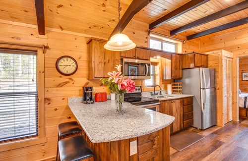 - NOTE: This single-story cabin offers step-free access. Exterior stairs and an unpaved path are required to access the lake and fire pit area behind the home