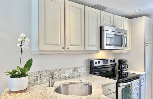 The updated eat-in kitchen includes a grand granite countertop with seating for dining or entertaining. It’s fully equipped with stainless steel appliances and all the essentials—blender, toaster, coffee maker, pots, pans, and more. A washer and dryer are in the unit for your convenience.