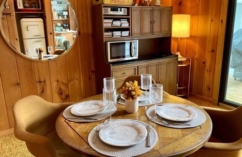 Nestled in a quiet pine forest, this cabin offers floor-to-ceiling windows for soaking in stunning mountain and water views. Its beautifully appointed interior combines the charm of mid-century design with the utmost in modern comfort.