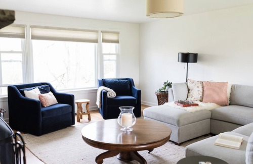 Each piece of furniture was curated with relaxation and luxurious comfort in mind. Enjoy the obnoxious amount of cozy throw blankets, light the fireplace, and sit back to unwind. The best view in the house is in the living room, with floor-to-ceiling windows overlooking the stunning waterfront property. The velvet swivel chairs offer the best views from the outdoors to the 55" smart TV! The comfortable sectional features a storage ottoman and one automatic reclining chair.