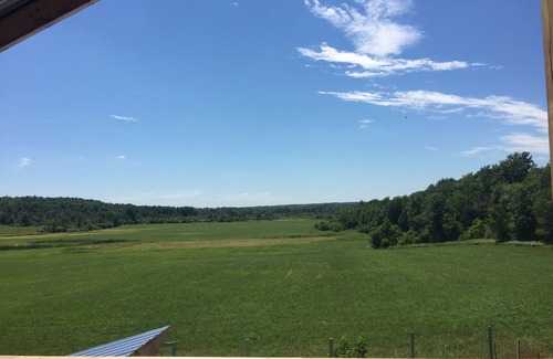 Our brand-new apartment is located on the second floor of our Amish-built barn. The front door and wood porch lead into a large foyer where you can leave your shoes and coats. Walk upstairs and you've got an open floor plan with amazing views of the countryside from decks on both the front and rear of the barn. The very large barn-width rear deck is the place to be to watch the sunset on warm evenings, while you scan the meadow for white-tailed deer, porcupine, and coyote, while listening to the meadowlarks and savannah sparrows.