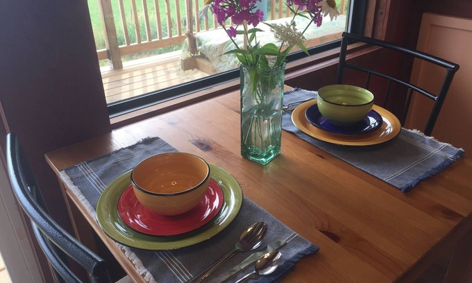 Inside the space, we offer one bedroom with a new Tuft and Needle queen-size bed, plus two more sleeping areas in shared space. The very large three-piece couch easily sleeps two adults, and the twin futon can sleep a small adult or child. Our kitchen has a two-burner electric cooktop, toaster oven, microwave oven, coffee maker, and small fridge/ freezer for your pleasure, plus a small kitchen table as well as bar seating. We love the locally-cut white pine butcher block counter top! The open floor plan with exposed beams is pleasing to the eye, and our ceramic tile shower stall will make you linger. Most of the decorations in the apartment come from our travels in South and Central America, East Africa, and Indonesia.