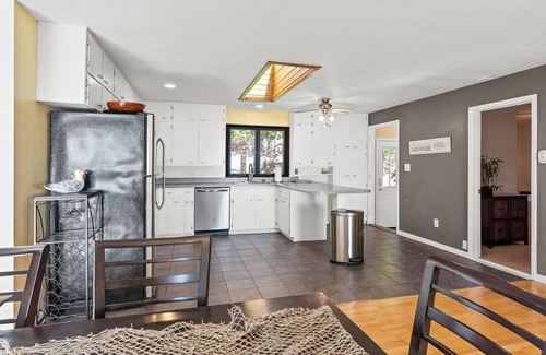 This home features 2 bedrooms and 1 bathroom. Bedroom 1 has a queen bed and bedroom 2 has two queen beds. This home is all main floor living with a large living room with view of Lake Michigan! The outdoor area at this home is great! It features a large yard, in ground trampoline, outdoor furniture and charcoal grill! The sunset views from the bluff are amazing. Barbecuing and watching the sunset makes for our favorite dinner location, but the Old Channel Inn right down the road is a close second. This home has an occupancy of 6 people maximum and is monitored closely.