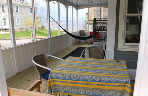 This bright cottage in the heart of Bayside is just a short stroll to the dock, swim float, playground and beach. The porch looks out upon the village green and Penobscot Bay. The cottage is handicap accessible with a small downstairs bedroom, a lovely master bedroom upstairs with an adjoining library with a fold out bed. "The Perch" is a sleeping loft which is popular with kids and teens. The spacious porch is great for relaxing in a hammock or entertaining a crowd. There is a nine hole golf course nearby and it's just a short ride to the vibrant city of Belfast.