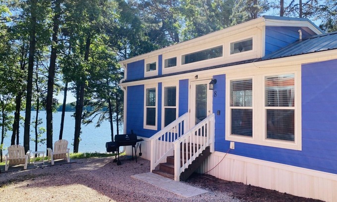 Every cabin is specially equipped with everything you need to enjoy your time at the lake. This tiny house cabin boasts a queen size memory foam bed in private bedroom. the bunk-bed they are twin size. The living room has tiny-house couch. The carpeted ""fort style"" loft has a twin-size floor mattress for the kids. Bring the sleeping-bags to create the full effect of camping out. There is a full kitchen, dining room that seats four, and everything you need to enjoy coffee or tea in the morning.