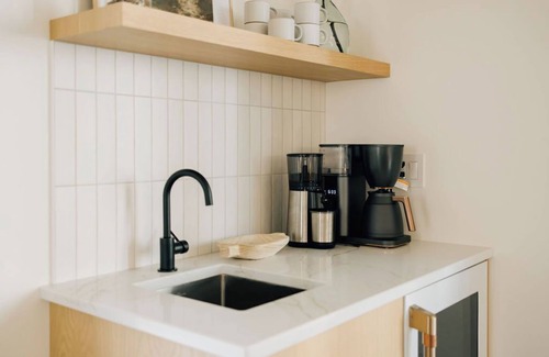 The home boasts a full kitchen equipped with all the necessary amenities, including a dedicated coffee bar and a wine fridge.