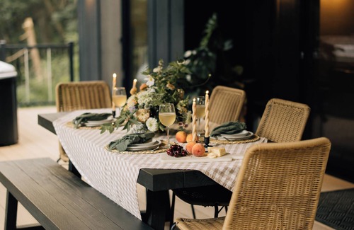 The outdoor dining table is perfect for al fresco meals along with the outdoor stairway grants easy access to the creek & fire pit area, adding an element of adventure to your stay.