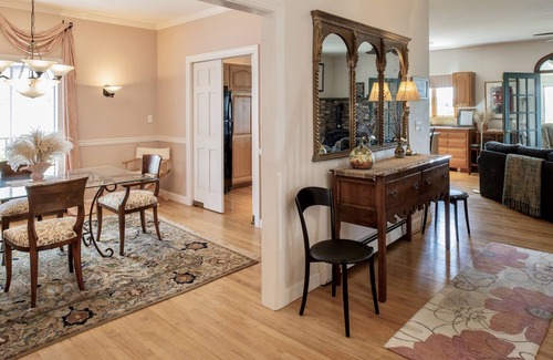 Seating for four on the kitchen island; seating for six in the dining room. Lovely linens, dishes, silver, glassware...