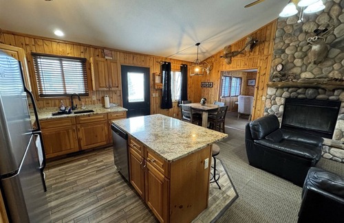 You’ll have plenty of room with 2300 sq ft inside and over an acre of lakeside fishing property outside. This walk-out ranch cabin has 4 bedrooms and 2 full bathrooms and can sleep up to 12 with a king bed, 3 full beds, and 2 sets of twin bunks.
