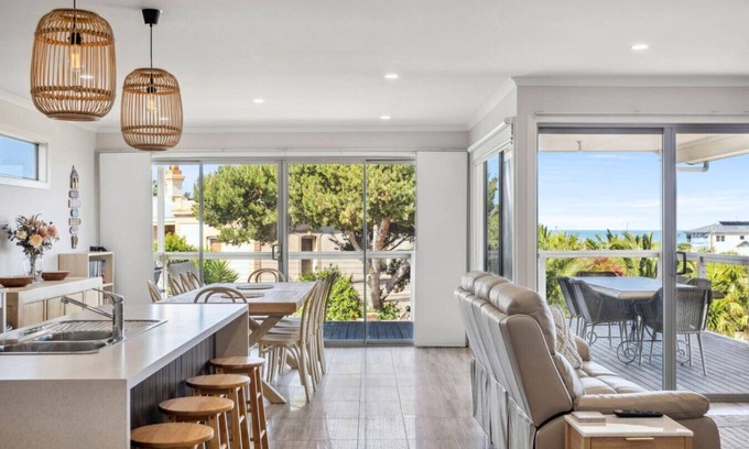 Bathed in natural light and styled with breezy coastal touches, this retreat frames sweeping views across the leafy neighbourhood with glimpses of the sea beyond. The upstairs lounge invites you to stretch out on plush seating and stream your favourite shows on the large TV, a cosy way to unwind after a day by the coast. Downstairs, a second lounge provides extra space for quiet reading or late-night conversation.