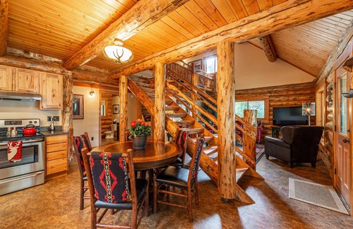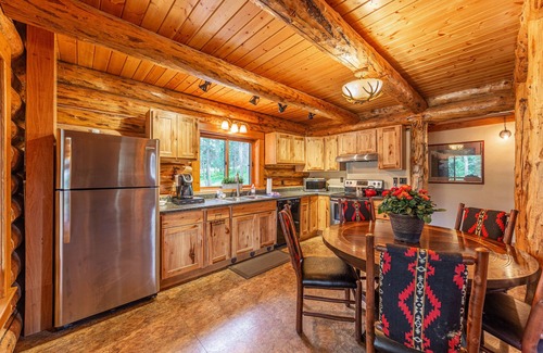 The Manor cabin is a secluded two-bedroom house with a four-person sleeping loft, offering beautiful lake and mountain views. Both bedrooms have king beds, and the loft has one double bed and single bunk beds. The cabin comes with two full bathrooms, and the kitchen has full-size modern appliances. Large patios and a BBQ grill are available for guests to enjoy. The Manor cabin is perfect for a large family or a group of friends, accommodating up to eight guests. Because of our remote location, WIFI is limited. Two-night minimum stay (three nights in July). Pet friendly, with an additional cleaning fee, 2 pets max. Boat mooring is also available for a nightly fee. Please call the Lodge to reserve a slip.