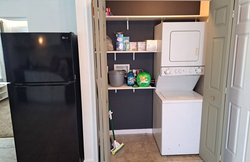 There is a washer and dryer on the main floor, and an ironing board and iron upstairs.