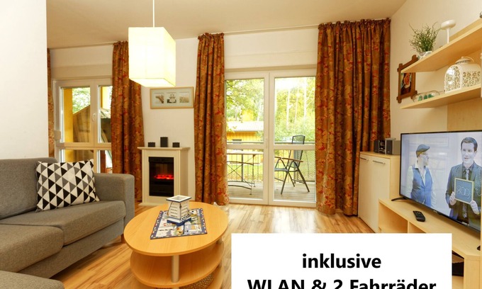Cozy and modern apartment with electric fireplace and large balcony. The 2-room apartment & # 132; Ostseewald & # 147; is infinitely and barrier-free to reach. Your new holiday home is equipped with underfloor heating, nice kitchen and LCD TV with Freeview. The beach is just 150m and small shops, restaurants and the small harbor in Zempin are within walking distance. Enjoy and experience the beautiful sunny island of Usedom. ~ ROOMS: 1 living room with electric fireplace 1 bedroom with double bed (1,80 x 2m) & single bed (0,90 x 2m) 1 kitchen with dining area 1 balcony with furniture and beach chair 1 parking space 1 storage room including 2 bicycles 1 travel cot and High chair ~ OCCUPANCY: 3 people and a toddler up to 2 years ~ EQUIPMENT: floor heating, electric fireplace, TV + Freeview, DVD player, balcony furniture, radio with CD player, very well equipped kitchen with ceramic hob, oven, microwave, refrigerator, Freezer, glasses, crockery, cutlery ~ OTHER: - Bed linen can be put on site for 9, - & # 128; and towels for 7, - & # 128; per person - bed linen from 7 days included - cots are please bring your own - free WIFI ~ PETS: A maximum of 1 dog up to a size of about 30 cm and for a fee of 30.00 & # 128; authorized. Within the plant there is a linen obligation. ~ ATTENTION: - There are two bicycles available for free use. The use of the bicycles is at your own risk. - Guests can use free Wi-Fi. These are voluntary additional benefits, so no guaranteed in the travel law sense property of the apartment. Rent reduction can not be claimed in case of failure. ~ Additional prices + deposit 50, - & # 128; on site + local tax