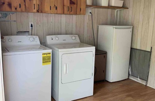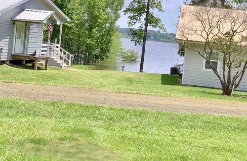 Main house includes 2 bedrooms and 2 full bathrooms, living room, and full kitchen. First room has queen size bed with full bathroom included. Second room has king size bed with full bathroom located just outside the door. Game room is separate structure located out back in the garage. Game room includes 65 inch flat screen tv with streaming capabilities, dart board, bar height table for poker/dominoes, A/C and heat. Living room includes 2 electric reclining leather couches and 60" flat screen TV with streaming capabilities. Expandable dining table and bar seating that looks into the kitchen. Full kitchen includes oven, stove, microwave, fridge, coffee pot, dishes, and silverware. Laundry room is also a separate structure located in back yard with full washer/dryer and window unit. Great views of the lake from the front porch. Charcoal fire pit in front yard. Another covered porch out back and no rear neighbors. Boat ramp located within walking distance in the neighborhood.