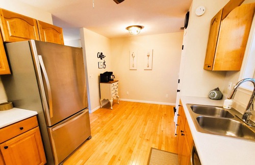 The bright, comfy kitchen is fully equipped with updated appliances, cookware, bakeware, utensils, and a variety of small appliances including an Instant Pot, blender, toaster, and hand mixer. The coffee station with Keurig, drip, and French press options has its own open corner so that it remains accessible and doesn’t interfere with meal prep. A full-size refrigerator and dishwasher make meals and cleanup easy. Just steps away, the adjoining dining area features a large table with seating for 10, perfect for family meals or game nights.
