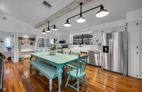 The house boasts three spacious bedrooms and two full bathrooms, with an open concept layout that's perfect for spending quality time with family. Whether you're lounging on the oversized couch and watching TV on the large mounted flat screen or cooking a meal in the fully-stocked farmhouse kitchen, you'll feel right at home. The farmhouse table can comfortably seat eight people.