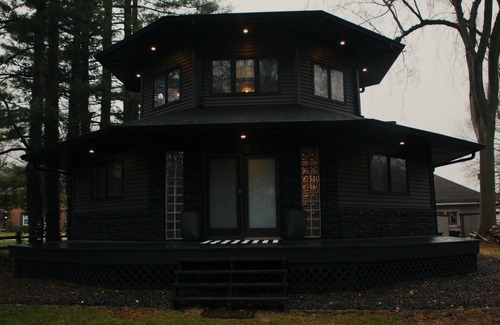 Welcome to our viral sensation VRBO with its stunning modern black exterior and interior! Nestled in Lincoln, Illinois, this uniquely tranquil octagon home is ready to welcome you. Originally built in 1993 and completely renovated in 2021, this 1,500 square foot home offers a blend of modern comfort and historic charm. Situated on a spacious fenced lot, the distinctive octagon design, a throwback to the 1800s, ensures there are no square rooms, creating a unique and inviting atmosphere.
