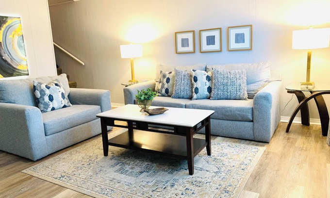 The living room features a comfortable new couch and oversized chair with a 55" Roku TV. The eat in kitchen has seating for 5, a full size washer/dryer, and french doors leading to the patio where you can enjoy outdoor dining.