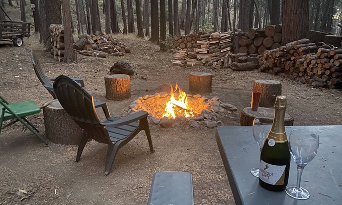 We have an additional campsite on the property that has its own fire ring and chairs for tent camping/camper van set up, but just a bridge walk over the creek to main sitting area that guests over standard 6 can use for an additional fee of $25 per night.